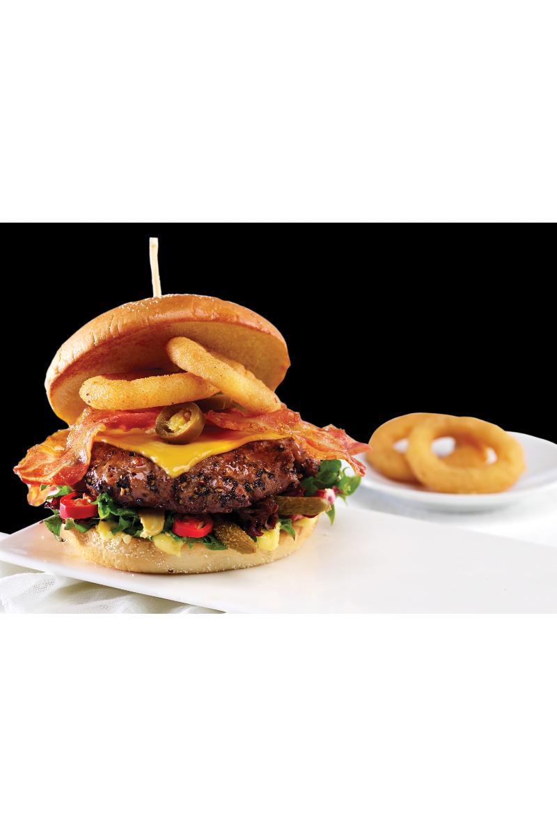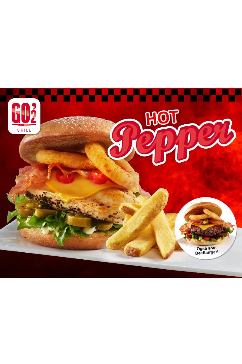HOT PEPPER er en ekstra tjukk og saftig beefburger, eller kyllingfilet, med pepperkant, toppet med løkringer,ost og bacon, med jalapeños,cornichons, rød chili, salat, smokeyaioli. HOT PEPPER serveres medpommes bistro med skall, løkringerog beger med smokey aioli. Ønsker du en litt sunnere variant, velg søtpotetfries!