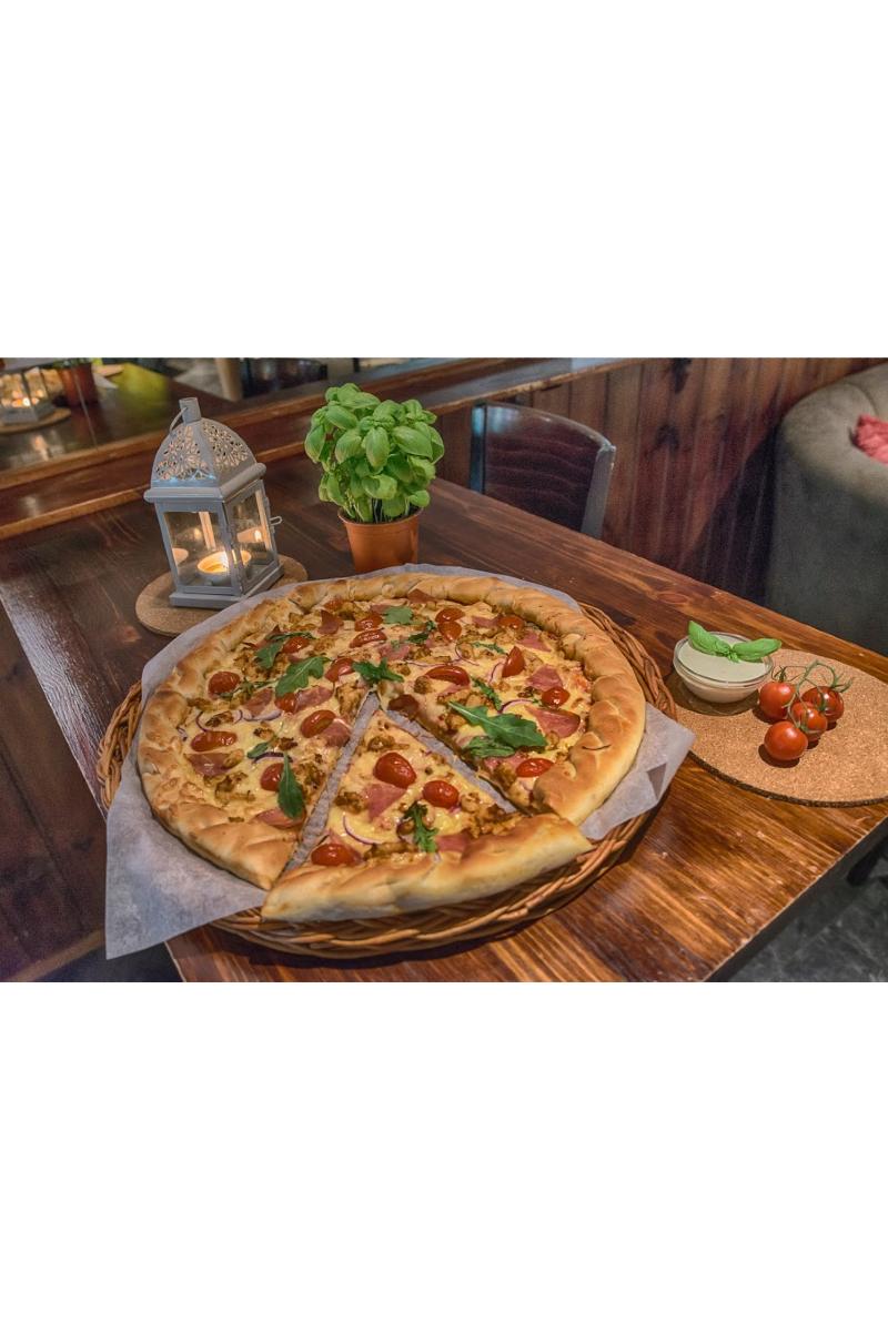 Italiensk spekeskinke, marinert kylling, rødløk, cherrytomat, fersk ruccola, ost, pizzasaus