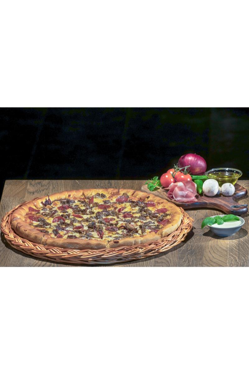 Marinert biffkjøtt , pepperoni, kjøttboller, rødløk, ost, pizzasaus