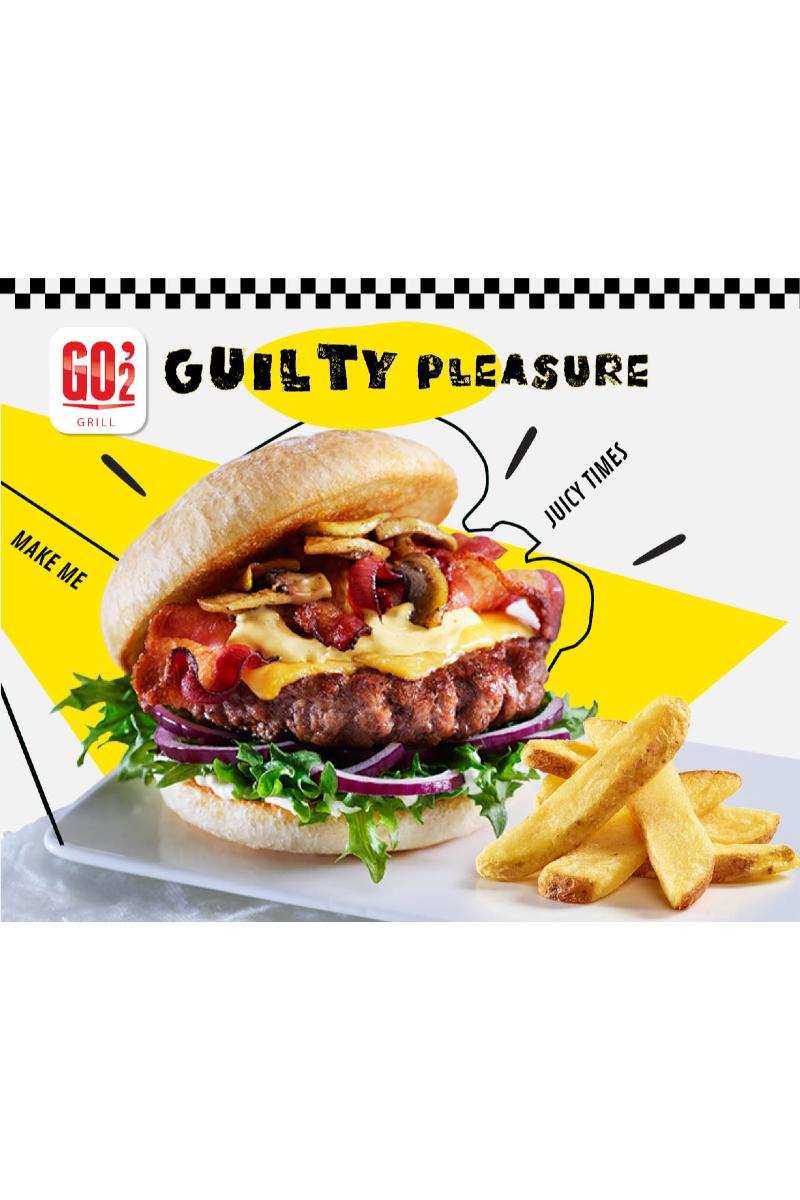 GUILTY PLEASURE er en ekstra tjukk og saftig beefburger, eller kyllingfilet, toppet med trippel bacon, dobbel burgerost med champignon og hvitløkssmør, med løk, salat og litt aioli i surdeigsbrød. GUILTY PLEASURE serveres med pommes bistro, chilicheese nuggets og beger bearnaise dipp